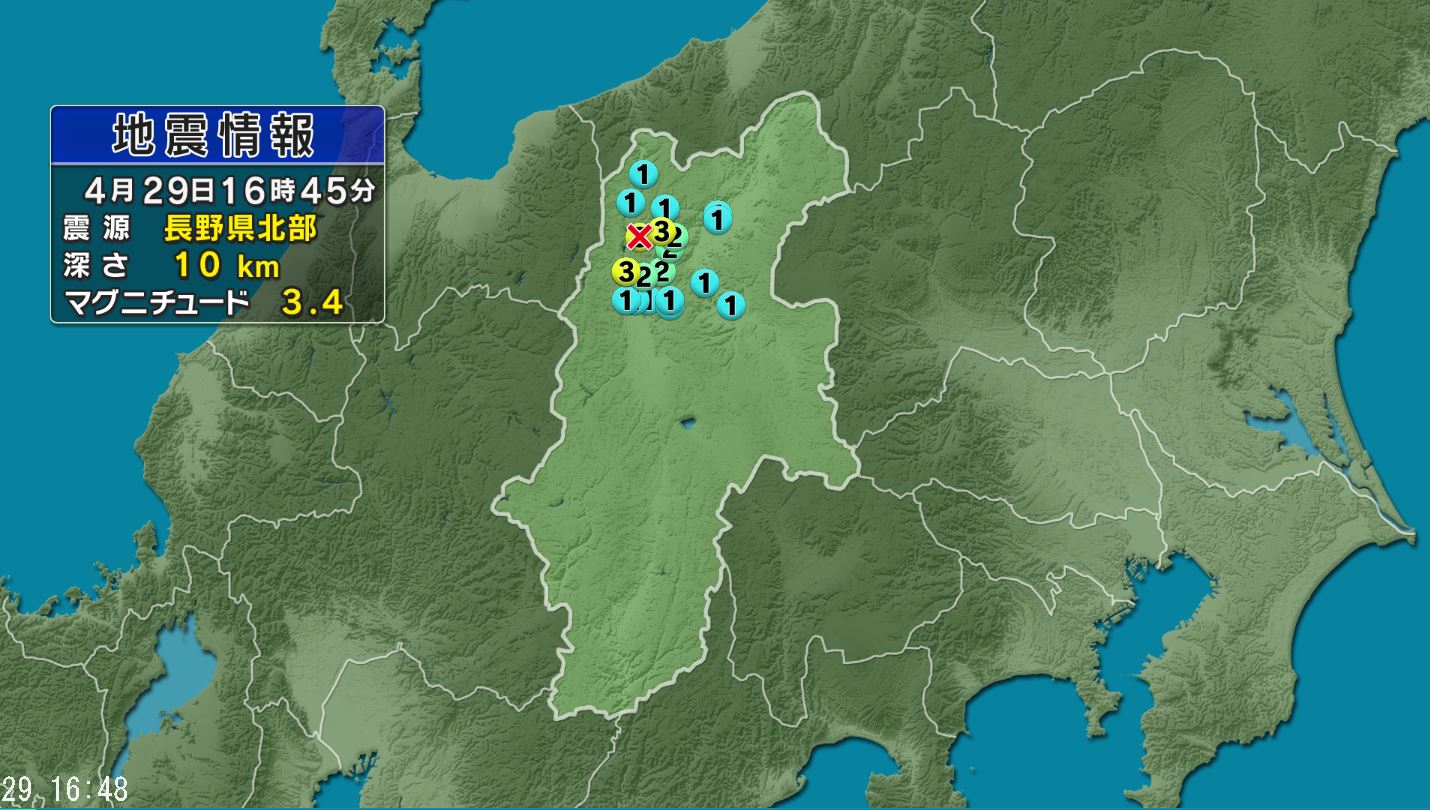 4月29日午後4時45分ころ、長野県北部を震源とする地震がありました。震源の深さは約10キロ、地震の規模を示すマグニチュードは3.4と推定されます。
