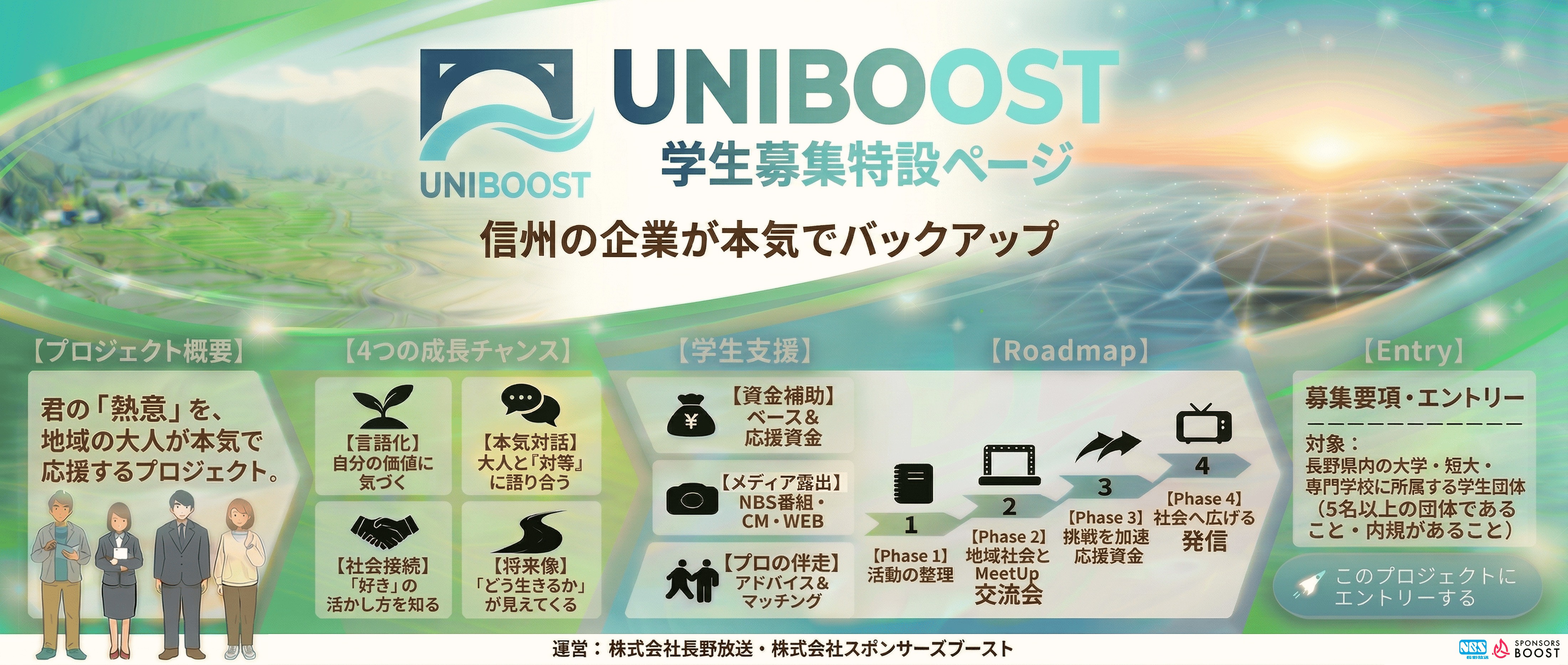 UNIBOOSTは、長野放送(NBS)がプロデュースする、県内大学生の“本気の活動”を地域企業が直接支援するプラットフォームです。